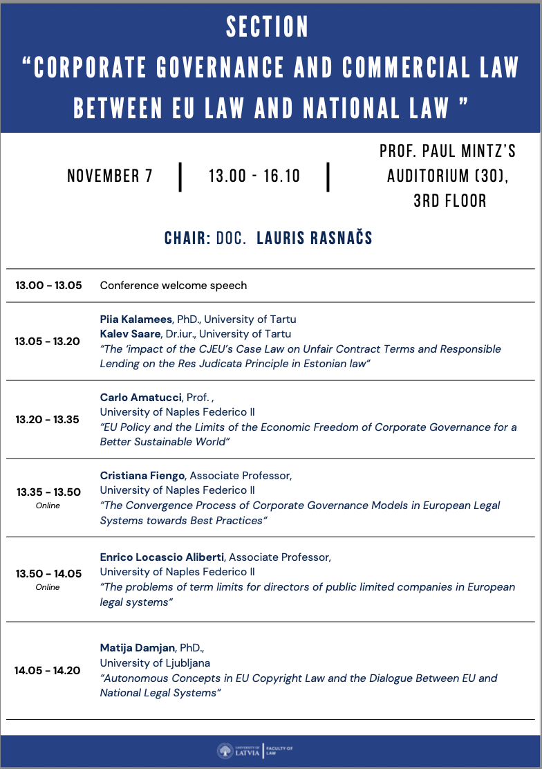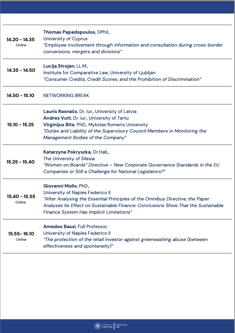 This section will include speakers from Italy, Poland, Slovenia, Cyprus, Estonia, Lithuania, Estonia and Latvia and will cover wide variety of topics, starting with the corporate and company law and its interaction with sustainability requirements until the matters of consumers protection law and prohibition of unfair commercial practices. Thus the presentations, included in this section, could be of interest not only for legal scholars, judges, attorneys, in-house lawyers, but also for the officials of the business registers and consumer protection institutions, as well as sustainability officers of the company.
